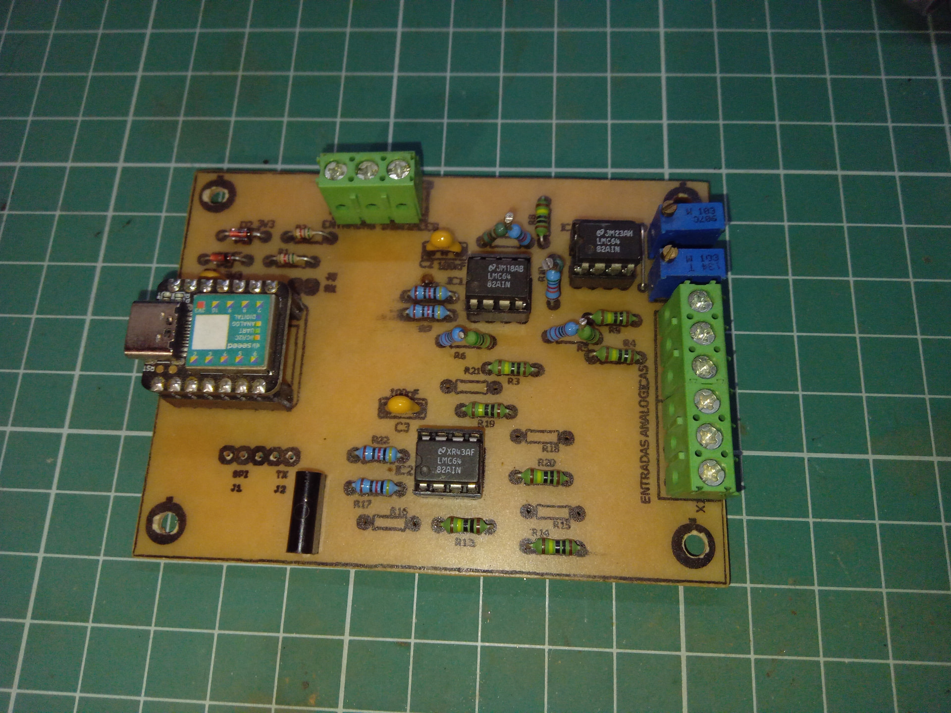 Al armar la placa tenemos que definir que rango de entrada queremos, la placa original tiene un rango de entrada desde -10V a 10V, o sea un rango de 20V lo lleva a unos 3V que son la entrada del ADC del XIAO (a mi me dio de 0,2V a 2,96V), por ejemplo en este caso el factor de ganancia es 0,143, la placa tiene 1M Ohm y 143k Ohm. Si quisiéramos 0 a 5V de entrada sería 2,86V/5V nos queda un factor de 0,572