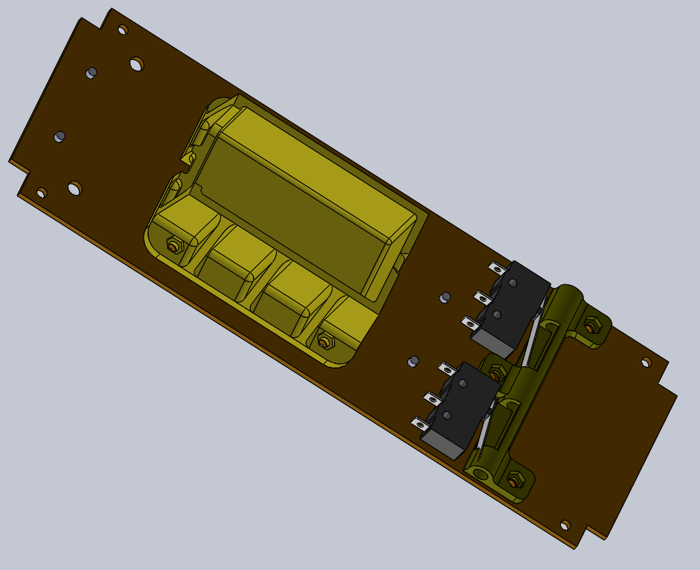 Mi idea era hacer algo parecido a lo que usan sistemas militares, en donde se remueve un seguro en forma de pin pasante, para lo cual usé 2 microswitch y un alojamiento para una varilla redonda que sería el pasador (barra rectificada canibalizada de lectoras de CD viejas).